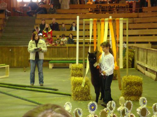 Laura hat in der Prüfung "Showmanship" mit Celina, die 1-j. Tochter von Conchita, den 1. Platz gemacht.In dieser Prüfung wird nicht das Tier bewertet, sondern die führende Person. Laura musste einige Fragen zum Thema Alpaka beantworten und das Tier ohne viele Korrekturen in einer bestimmten Art und Weise der Jury vorstellen. Die beiden haben ihre Aufgabe toll gemacht.