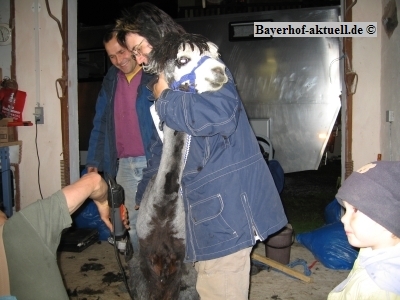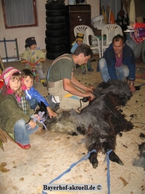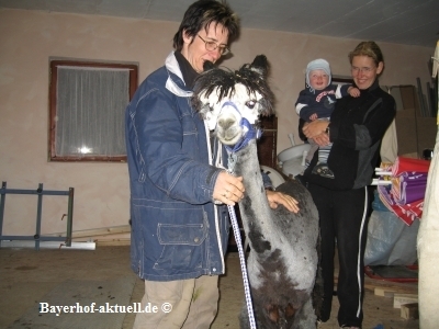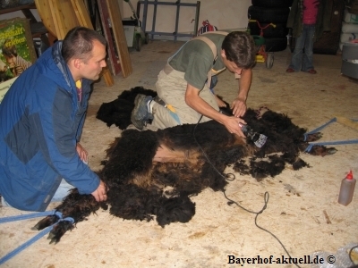 ) und einem Anhänger noch einmal nach Deggendorf zur Fam. Schreiber. Da weder Klaus noch Mini je ein Tier geschoren hatten, brauchten sie jetzt, beim 1. Mal, doch etwas Schützenhilfe. Karl-Heinz und Sonja waren so nett, diese zu geben.