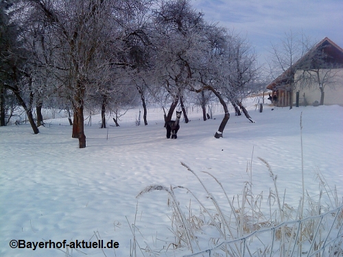 So lange es nicht schneit, sieht man regelmääsig draussen. Wehe, es schneit, dann sind die beiden älteren Alpakas, er und Sheela, verschwunden.